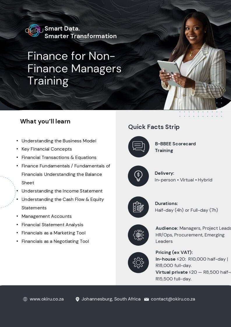 In-house ≤20 — R10,000 half-day | R18,000 full-day.