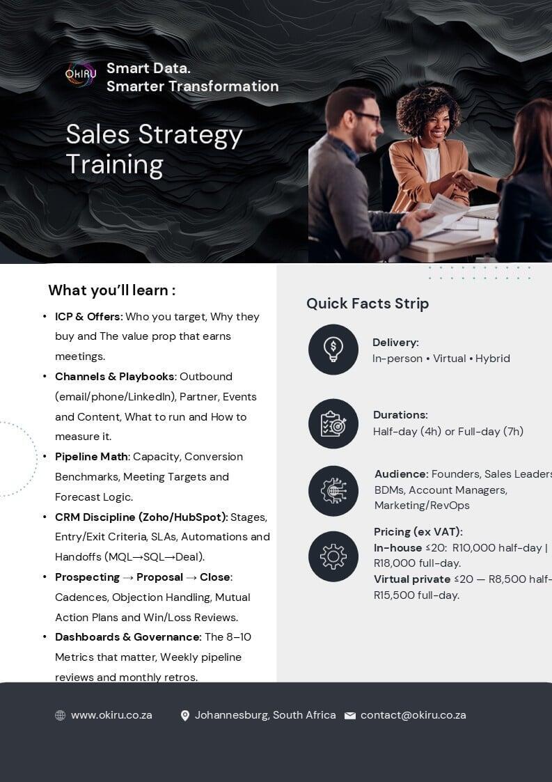 - Dashboards & Governance: The 8–10 Metrics that matter, Weekly Pipeline Reviews and Monthly Retros.